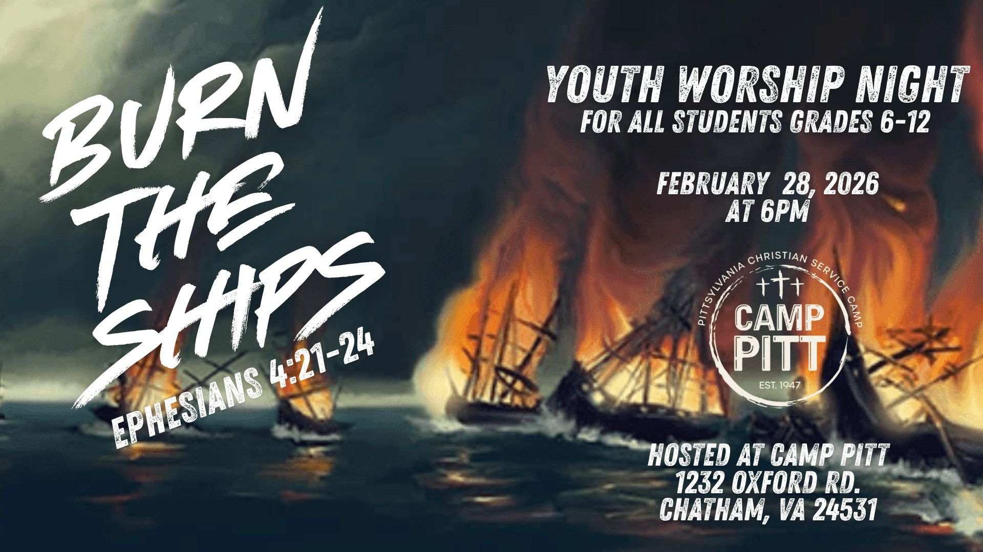 Youth Worship Night begins at 6:00pm in the Camp Pitt gymnasium. Food and drinks provided! Free of cost! All are welcome! Bring your youth group and friends. Email moc.liamgobfsctd-67e136@eciffottippmac with any questions.